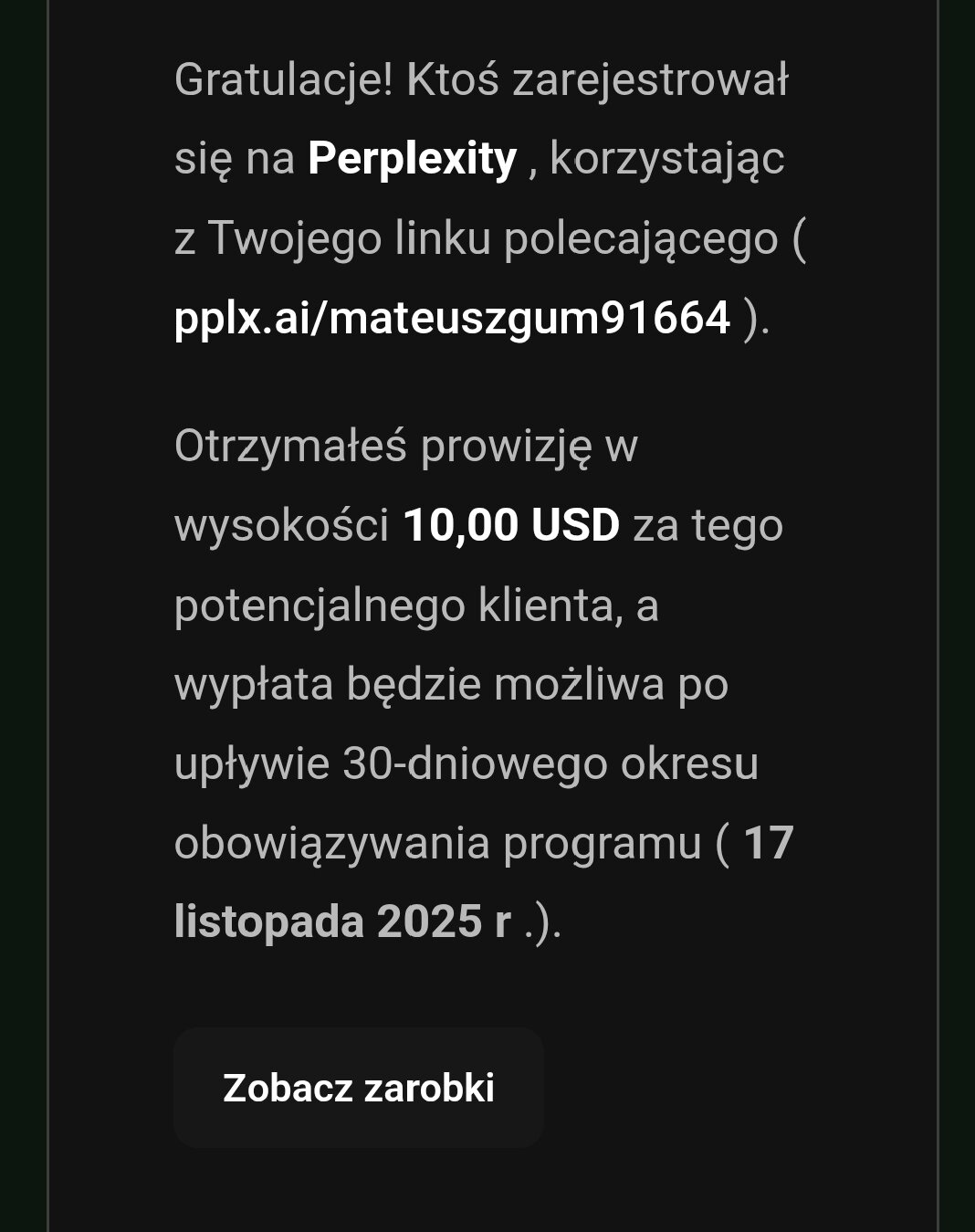 mati1503 Napisano Sobota o 20:30 Zgłoszenie Podziel się Napisano Sobota o 20:30 Trafiłem na ciekawą promke tylko na PC za polecenie przeglądarki instalacje i zadanie pytania np. "opowiedz mi żart" COMET dają 10$ w PL przez VPN na stany jest to 15$ polecony ma miesiąc planu PRO za darmo warto spróbować ta sama przeglądarkę w promocji na rok ma T-Mobile więc jest szansa że wypłacać będą 😃 poleć kumpla koleżankę Do wypłaty po 30 dniach Reflink 👇 https://pplx.ai/mateuszgum91664 Odnośnik do komentarza Udostępnij na innych stronach More sharing options...