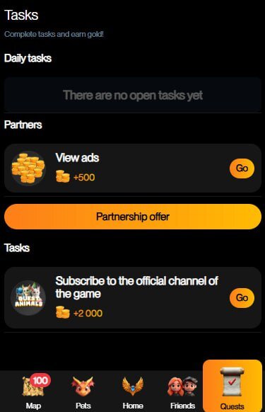 Jeśli masz kanał, grę lub aplikację z podobną liczbą użytkowników, jaką mamy w grze, jesteśmy gotowi rozważyć partnerstwo oparte na zasadzie „okresowych publikacji na Twoim kanale z Twojej strony i publikacji w sekcji zadań z naszej strony” lub „wzajemnego umieszczania w sekcji zadań”, jeśli masz grę lub aplikację. Jeśli jesteś zainteresowany taką współpracą, skontaktuj się z nami za pośrednictwem wiadomości prywatnej na kanale, aby to omówić https://t.me/questanimals?direct