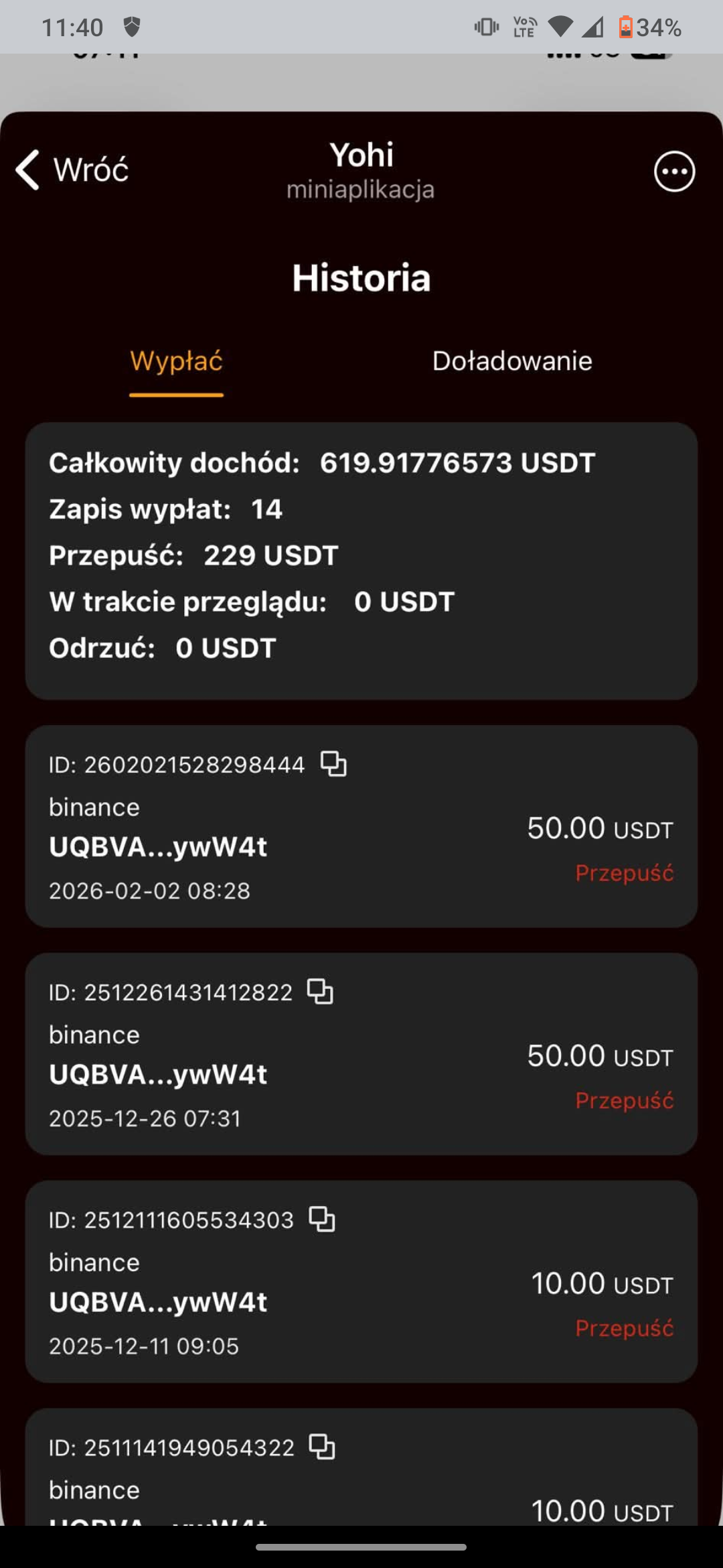 miron83 Napisano 18 Styczeń Autor Zgłoszenie Podziel się Napisano 18 Styczeń Od admina info Możesz zdobyć dwa rodzaje aktywów cyfrowych: 🤩Monetę Yohi (YOHI): Obecnie w fazie przedpremierowej. Wszystkie zdobyte YOHI będą tymczasowo przechowywane w Twoim portfelu Yohi. Wypłaty zostaną włączone po oficjalnym uruchomieniu monety. 💵USDT: Dostępne do natychmiastowej wypłaty w godzinach pracy. Wszyscy użytkownicy (zarówno zwykli, jak i VIP) mogą wypłacić USDT, gdy ich saldo osiągnie minimalny próg 2 USDT. Odnośnik do komentarza Udostępnij na innych stronach More sharing options...