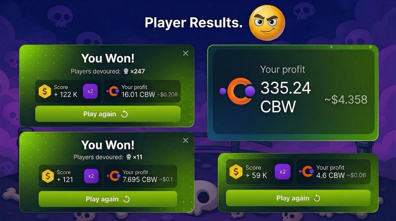 Jeśli absorbujesz te monety (?), możesz zarobić do 0,1 CBW za monetę z mapy, a także z absorbowania prawdziwych graczy, a czasem botów.