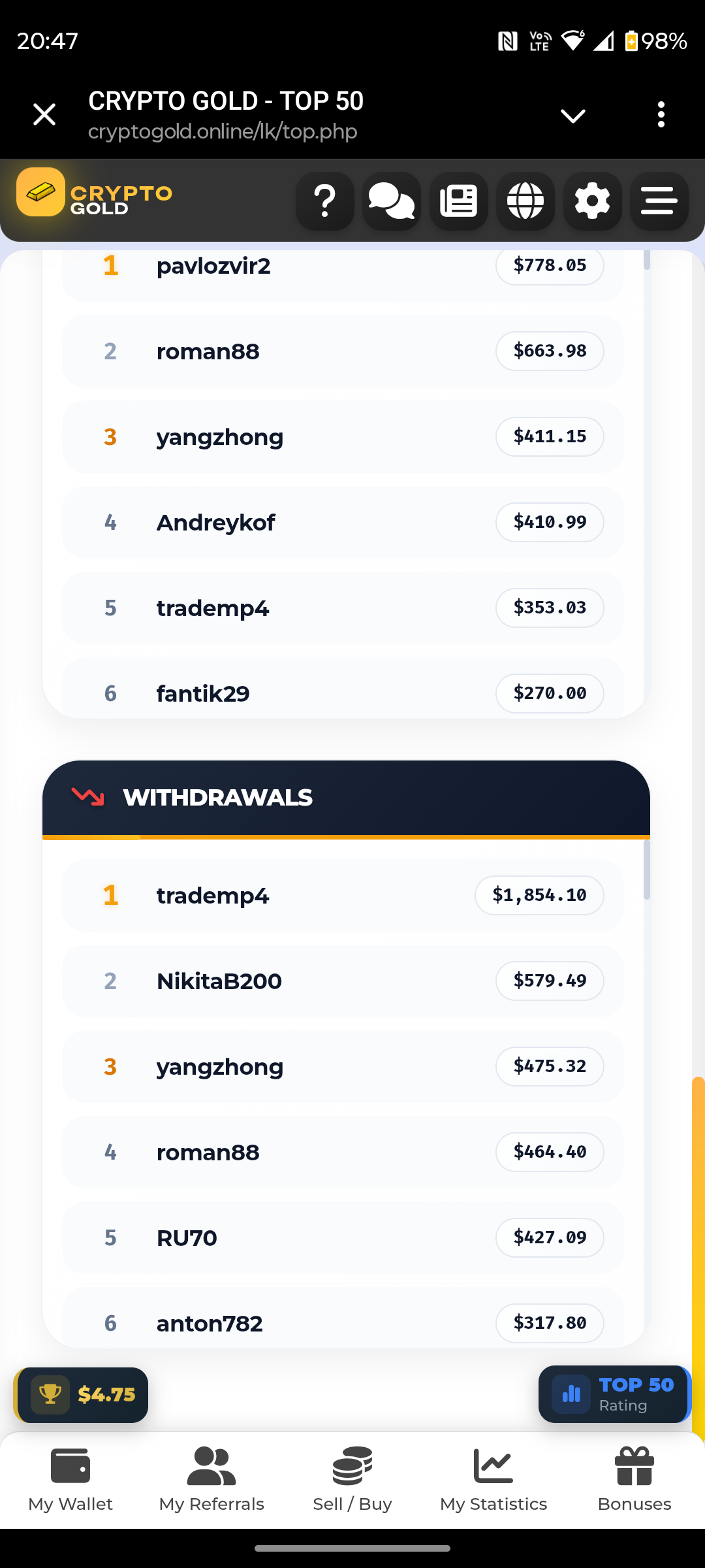 Możesz również zarabiać od zera dzięki systemowi poleceń: za zarejestrowanie 1 poleconej osoby otrzymasz 0,10$ w monetach, a także 5% od kwoty pierwszego depozytu poleconej osoby, a dodatkowo zarabiasz 50% od kosztów wszystkich podwyżek limitów przez poleconych.