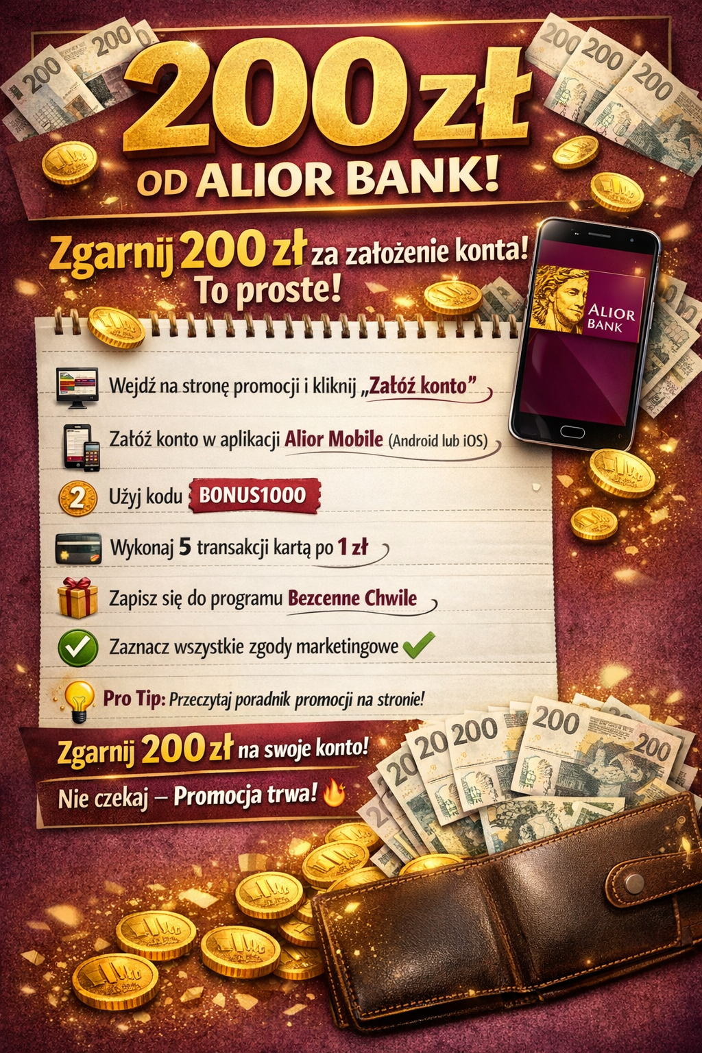 Doradca Napisano Sobota o 19:17 Zgłoszenie Podziel się Napisano Sobota o 19:17 (edytowane) 💰 200 zł od Alior Bank! Chcesz zgarnąć 200 zł za założenie konta? To proste! 🏦 1️⃣ Przejdź na stronę promocji Alior Bank i kliknij 👉 „Załóż konto” tylko z linku promocji 2️⃣ Załóż konto przez aplikację Alior Mobile (Android lub iOS) 3️⃣ Użyj kodu BONUS1000 4️⃣ Wykonaj 5 transakcji kartą – każda wystarczy po 1 zł 💳 5️⃣ Zapisz się do programu Bezcenne Chwile 6️⃣ Zaznacz wszystkie zgody marketingowe ✅ 💡 Pro tip: Najpierw przeczytaj cały poradnik promocji na stronie, żeby nie pominąć żadnego kroku! 💸 Gotowe! Po spełnieniu wszystkich warunków 200 zł wpadnie na Twoje konto. Nie czekaj – promocja czeka! 🔥 Edytowane Sobota o 19:35 przez Doradca Odnośnik do komentarza Udostępnij na innych stronach More sharing options...