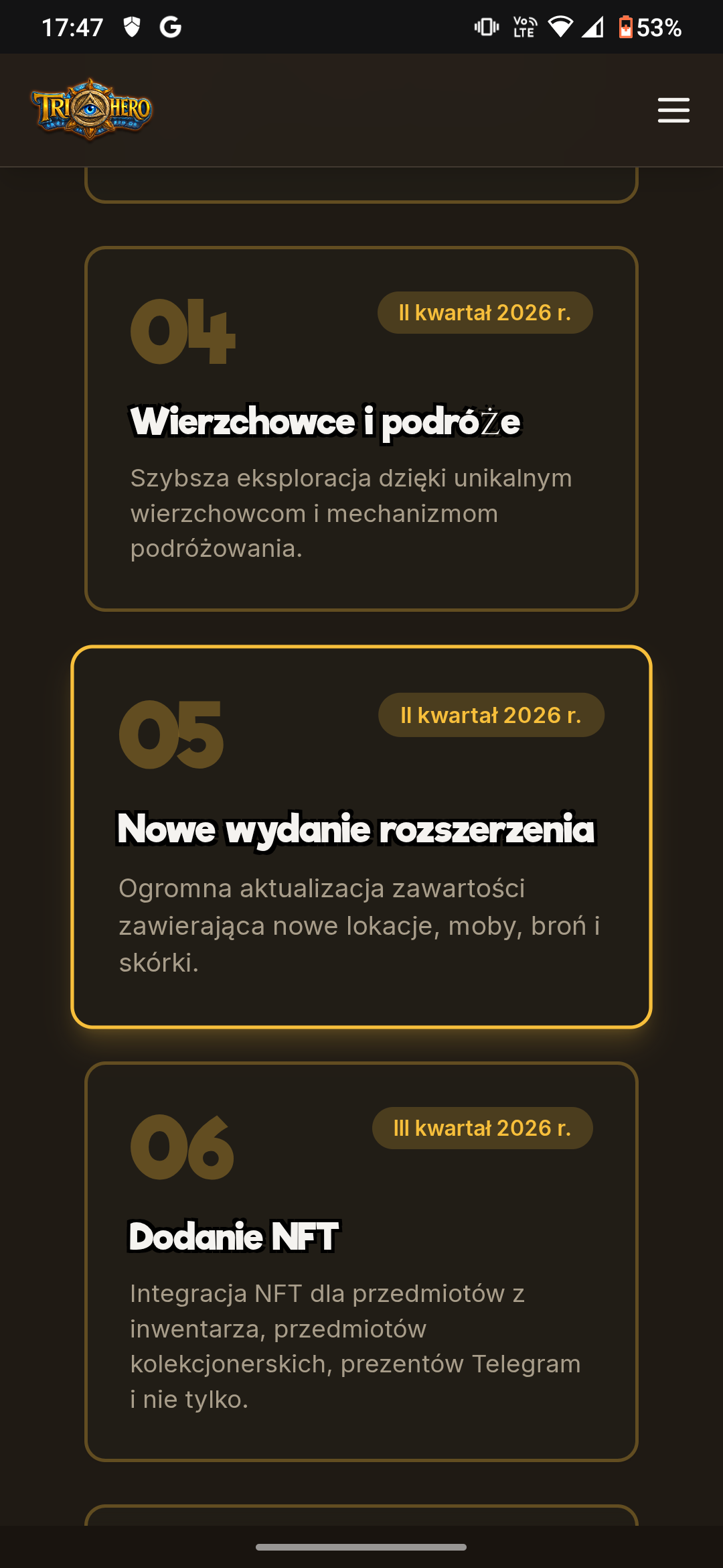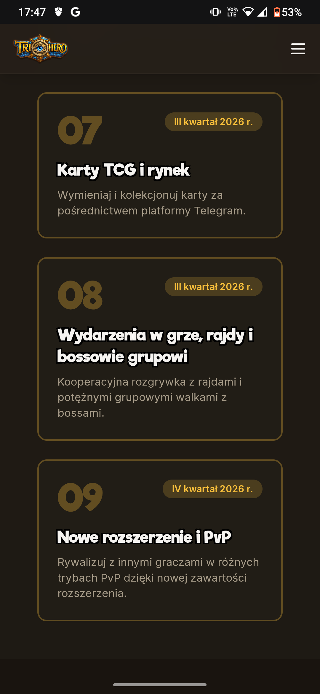 miron83 Napisano Sobota o 17:04 Zgłoszenie Podziel się Napisano Sobota o 17:04 Kolejna gierka wleciała Info poniżej o niej z chata Graj w Telegramie bez pobierania i instalowania. Po prostu czysta akcja dungeon crawlingu w Twojej ulubionej aplikacji do przesyłania wiadomości. TrioHero wprowadza klasyczne gry RPG w nową erę. Odkrywaj zdradliwe lochy, walcz z dzikimi potworami i zbieraj potężne duchy żywiołów. Opanuj sześć unikalnych typów duchów, z których każdy ma niszczycielskie zdolności i ścieżki rozwoju. Graj za darmo i wkrótce otrzymaj opcjonalne przedmioty kolekcjonerskie NFT. Wymieniaj się rzadkimi przedmiotami, unikalnymi miksturami i ekskluzywnym wyposażeniem na rynku Telegrama. ❓ Czym jest TRIOOHERO? ℹ️ TRIOOHERO to oparta na Telegramie gra RPG typu idle dungeon crawler, obecnie w fazie beta. ❓ Jak grać? ℹ️ Gra się bezpośrednio w Telegramie za pośrednictwem https://t.me/TrioHeroBot. ❓ Czy gra jest ukończona? ℹ️ Nie, gra jest w fazie aktywnej beta, a wiele systemów jest wciąż w fazie rozwoju. ❓ Dlaczego nazywa się Trio Hero? ℹ️ Trio Hero oznacza jednego bohatera wspieranego przez dwa duchy, co zostanie dodane w przyszłych aktualizacjach. ❓ Czym są Duchy? ℹ️ Duchy będą miały drzewka talentów i pozwolą Ci dostosować rolę i styl gry Twojego bohatera. ❓ Czym jest Grindonit? ℹ️ Grindonit to główna waluta w grze, którą zdobywa się sprzedając przedmioty znalezione w lochach. ❓ Do czego służy Grindonit? ℹ️ Służy do kupowania przedmiotów od handlarza, który czasami pojawia się w lochach. ❓ Jaka jest główna pętla rozgrywki? ℹ️ Twój bohater wchodzi do lochów, pokonuje wrogów, zbiera przedmioty, sprzedaje je za Grindonit, awansuje i staje się silniejszy. ❓ Czy bohater może awansować? ℹ️ Tak, bohater zdobywa poziomy i staje się silniejszy w miarę postępów. ❓ Jakie statystyki ma mój bohater? ℹ️ Twój bohater ma DPS, Moc Zaklęć i Obronę, a wyższe wartości czynią go silniejszym. ❓ Jakie rodzaje przedmiotów istnieją? ℹ️ Przedmioty występują w klasach rzadkości: zwykłej, magicznej, epickiej i legendarnej i pasują do różnych slotów na wyposażenie. ❓ Czy istnieją różne rodzaje broni? ℹ️ Tak, broń jednoręczna jest szybsza, a dwuręczna wolniejsza, ale silniejsza. ❓ Jakie lochy są dostępne? Obecnie dostępne są portale: Cmentarz (łatwy), Las (średni) i Ogniste Ziemie (trudny). ❓ Czym jest Energia? ℹ️ Energia jest wymagana do wejścia do lochów i można ją odzyskać poprzez zadania lub Gwiazdki Telegramu. ❓ Czy zadania są w grze? ℹ️ Tak, zadania wymagają oczyszczenia określonych lochów, pokonania potworów lub bossów. ❓ Czy mój bohater może zginąć? ℹ️ Tak, lochy o wyższym poziomie trudności wiążą się z realnym ryzykiem i konsekwencjami. Ale można się odrodzić za darmo! ❓ Czy będą lochy bez końca? ℹ️ Tak, planowany jest tryb lochów bez końca z rosnącym poziomem trudności i rankingami. ❓ Czy przedmioty będzie można wymieniać? ℹ️ Tak, przedmioty, które będzie można wymieniać jako prezenty w Telegramie, są planowane w przyszłych aktualizacjach. ❓ Czy będzie PvP? ℹ️ Tak, PvP jest planowane w przyszłych aktualizacjach. ❓ Czy będzie mapa świata? ℹ️ Tak, duża mapa świata z wieloma lokacjami zostanie dodana później. ❓ Jak mogę zgłaszać błędy lub przekazywać opinie? ℹ️ Możesz zgłaszać błędy i przesyłać opinie bezpośrednio w społeczności, aby pomóc w ulepszaniu gry. Rejestracja https://t.me/TrioHeroBot?startapp=ref_1653374525 Odnośnik do komentarza Udostępnij na innych stronach More sharing options...