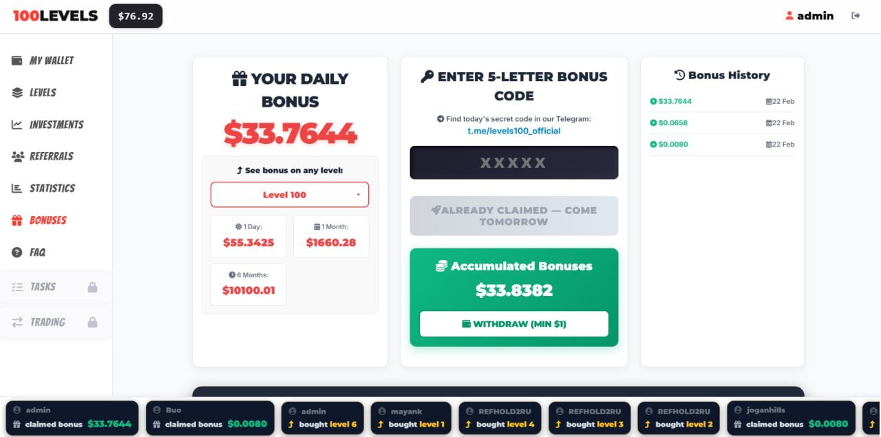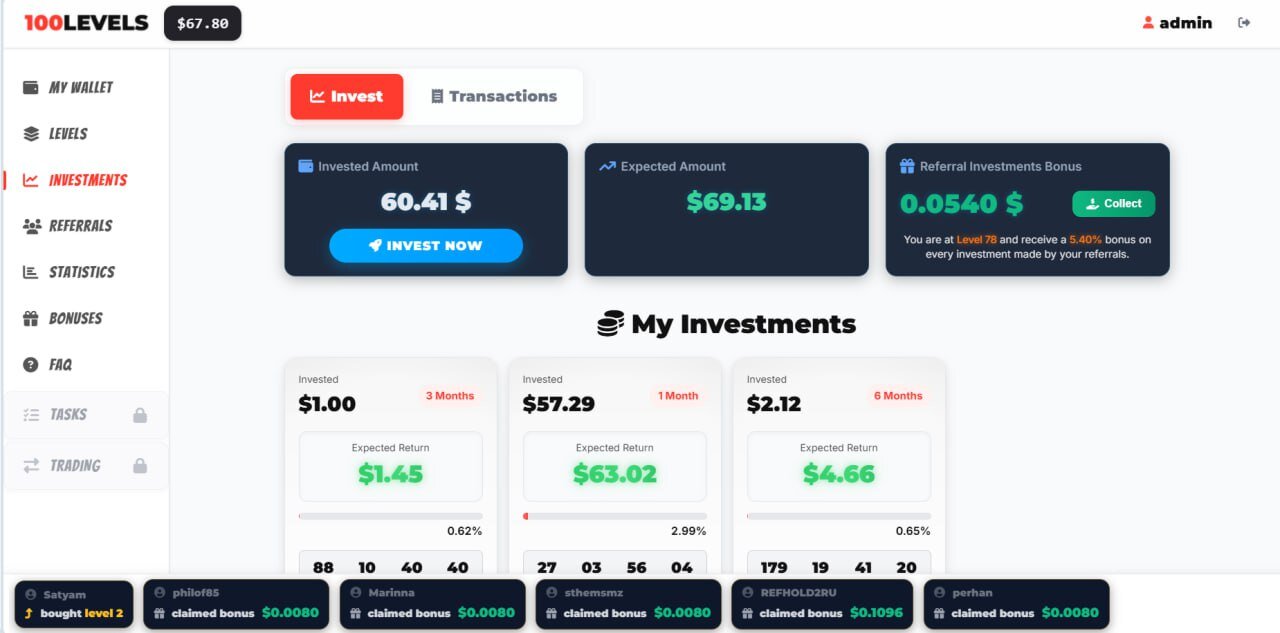miron83 Napisano 11 godzin temu Zgłoszenie Podziel się Napisano 11 godzin temu Info od twórcy projektu poniżej To bardzo prosta platforma i niezwykle opłacalna dla każdego uczestnika — i dla mnie również. Wyjaśnię wszystko krok po kroku. Zacznijmy od poziomów. W projekcie jest 100 poziomów. Każdy poziom jest kupowany tylko raz i na zawsze. Każdy nowy poziom, który kupisz: • Zwiększa Twój procent zysku z poleconych • Podnosi Twój limit wypłat • Pozwala Ci otrzymać 100% ceny poziomu za każdym razem, gdy któryś z Twoich poleconych zakupi ten sam poziom, który już posiadasz. Tutaj możesz zobaczyć, ile zarobiłeś i ile straciłeś zysku z powodu zakupu poziomów przez Twoich poleconych. Jeśli Twój polecony zakupi poziom wyższy niż ten, który obecnie posiadasz, staje się to Twoim utraconym zyskiem. 100% ceny poziomu trafia bezpośrednio na Twoje saldo główne — z którego możesz wypłacić środki w dowolnym momencie. Cena poziomów zaczyna się od 1 USD i dochodzi do 100 USD. Łączna kwota wymagana do zakupu wszystkich 100 poziomów wynosi 5050 USD. Oznacza to, że dzięki każdemu poleceniu możesz zarobić nawet 5050 USD — po prostu kupując te same poziomy, które już posiadasz. Przechodząc do bonusów. Będzie to codzienny kod bonusowy, który opublikujemy w Telegramie lub w innych naszych mediach społecznościowych. Nagroda za codzienny bonus znacząco rośnie z każdym poziomem. Na poziomie początkowym (poziom 1) otrzymujesz 0,008 USD dziennie. Na poziomie 100 bonus dzienny osiąga 55 USD dziennie. System bonusów dziennych jest skonstruowany w taki sposób, że: • W ciągu pierwszych 90 dni odzyskujesz 100% wszystkich pieniędzy wydanych na zakup poziomów. • W ciągu kolejnych 90 dni zarabiasz dodatkowo 100% zysku z zainwestowanej kwoty. Na przykład: Jeśli wydasz 300 USD na poziomy i codziennie będziesz otrzymywać bonus dzienny, w ciągu 180 dni zarobisz łącznie 600 USD. Oznacza to, że dosłownie nic nie tracisz — Twoja inwestycja w poziomy zwróci się w całości, przynosząc Ci czysty zysk. Inwestycja Projekt oferuje proste opcje inwestycyjne. Dostępne są różne okresy: 1 miesiąc, 3 miesiące, 6 miesięcy i 12 miesięcy. Im dłuższy okres, tym wyższa rentowność. Zysk: 1 miesiąc — 10% 3 miesiące — 45% 6 miesięcy — 120% 12 miesięcy — 400% Otrzymujesz również premię od inwestycji poleconych osób — im wyższy poziom, tym wyższy procent. CHCESZ ZAROBIĆ? ZAREJESTRUJ SIĘ W NAJLEPSZYM PROJEKCIE 👉 100 POZIOMÓW 🧨 Bonus dzienny na start 0,008$ 💸 Bonus dzienny do 55$ 😳 Możliwość zarobienia 5050$ za jednego poleconego 🫡 Świetny system poleceń 100% 😱 Inwestuj i zarabiaj pasywny dochód do 400% rocznie 💶 Bonus za wypłatę z polecenia do 5% 🤝 Bonus inwestycyjny za polecenie do 6,66% 💶 Minimalny depozyt 1$ 💶 Minimalna wypłata 1$ Rejestracja https://100levels.pro/?ref=478 Odnośnik do komentarza Udostępnij na innych stronach More sharing options...
